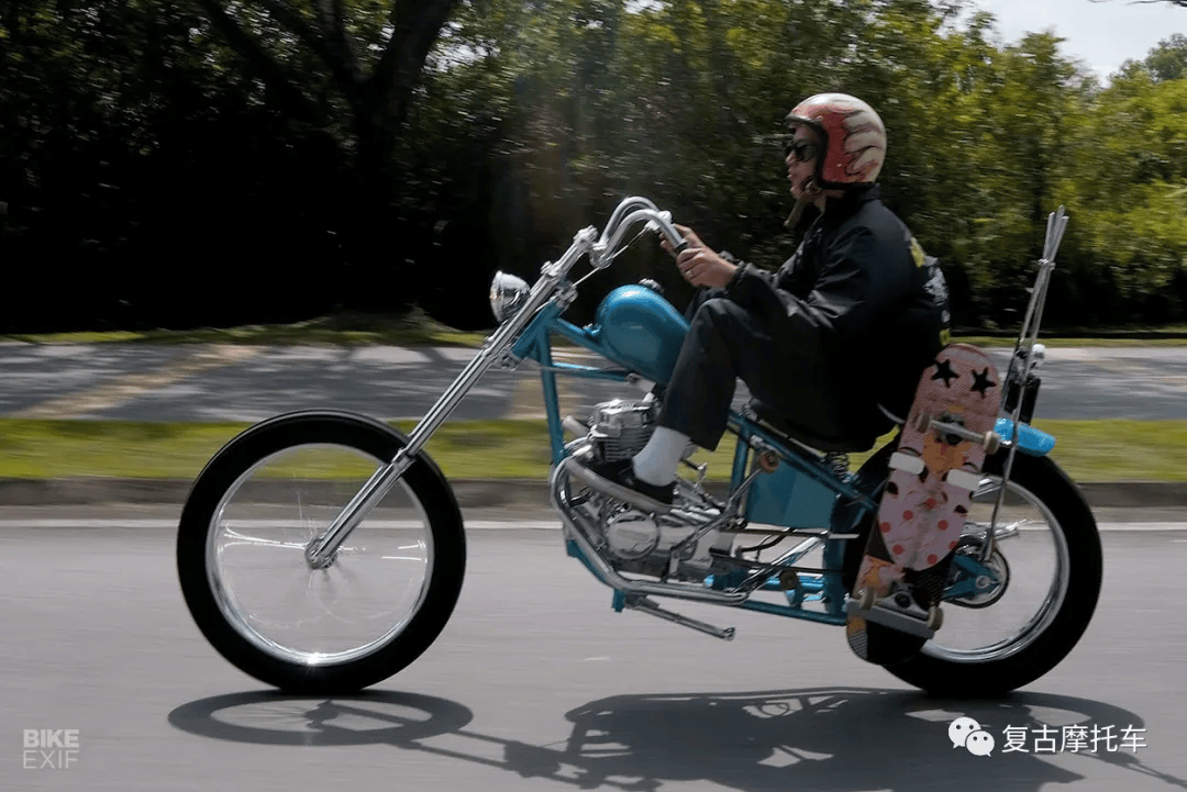 由于他喜爱滑板,还专门在这台车上增加了许多滑板元素。比方链条张紧器运用的是Nasir旧滑板上的轮子改造而来,在车身左边,又安装了可拆卸式的滑板固定装置。